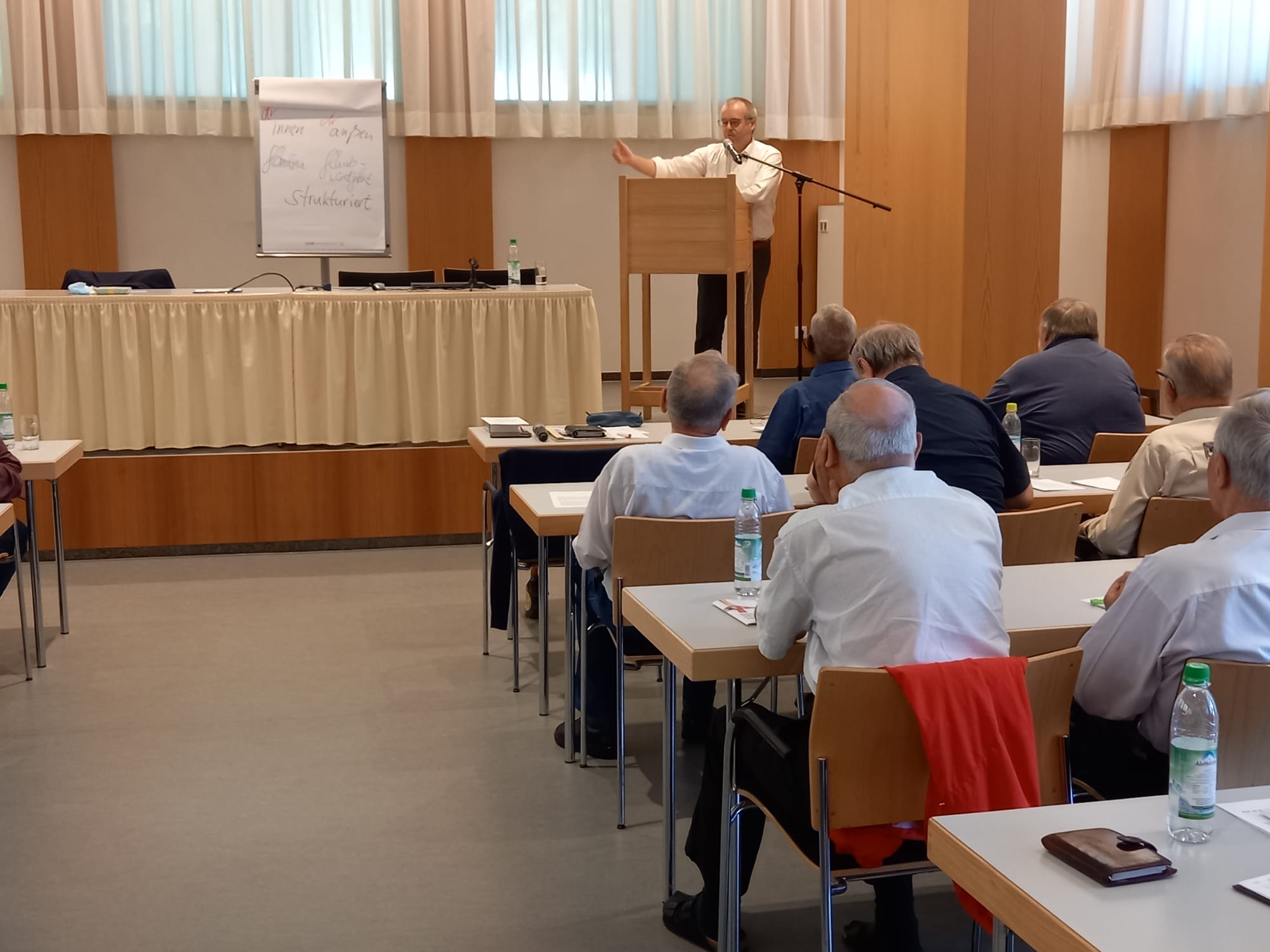 Nach zwei Jahren Corona-Zwangspause konnte erstmals wieder die "Fortbildungs- und Begegnungswoche für Priester und Diakone ab 65 Jahren" stattfinden. "Draußen zuhause" - das Motto von Jack Wolfskin beschreibt, worum es der Kirche zu gehen hat: dort präsent sein, wo sich das Leben der Menschen abspielt. Prof. Dr. Martin Ebner - als Würzburger Diözesanpriester selber Teilnehmer der Woche - zeigte auf, an welche Orte Jesus geht. "Jesus ist draußen zuhause und überall ansprechbar. Er geht an 'religiös verbotene Orte', in die geächteten Zonen, mit denen 'wir' nichts zu tun haben." Teilnehmer an "Straßenexerzitien" berichteten von ihrem Kontakt mit Obdachlosen, Betriebs- und Fernfahrerseelsorger von ihren Erfahrungen in Firmen und auf Lkw-Parkplätzen. Bei der Besichtigung der Moritzkirche im Zentrum Augsburgs kamen die Teilnehmenden mit dem Bereich der Cityseelsorge in Berührung. Prof. Dr. Hans-Joachim Sander verwies auf das Zweite Vatikanum, das in seiner Pastoralkonstitution dazu aufruft, draußen anzusetzen. Nur dann ist Kirche sie selbst. In einer Zeit, in der Kirche oft um ihre eigenen Probleme kreist, empfanden viele Teilnehmende den Blick nach außen als hilfreich und anregend. Die Woche im Exerzitienhaus Leitershofen war darüber hinaus ein wohltuendes Gemeinschaftserlebnis.